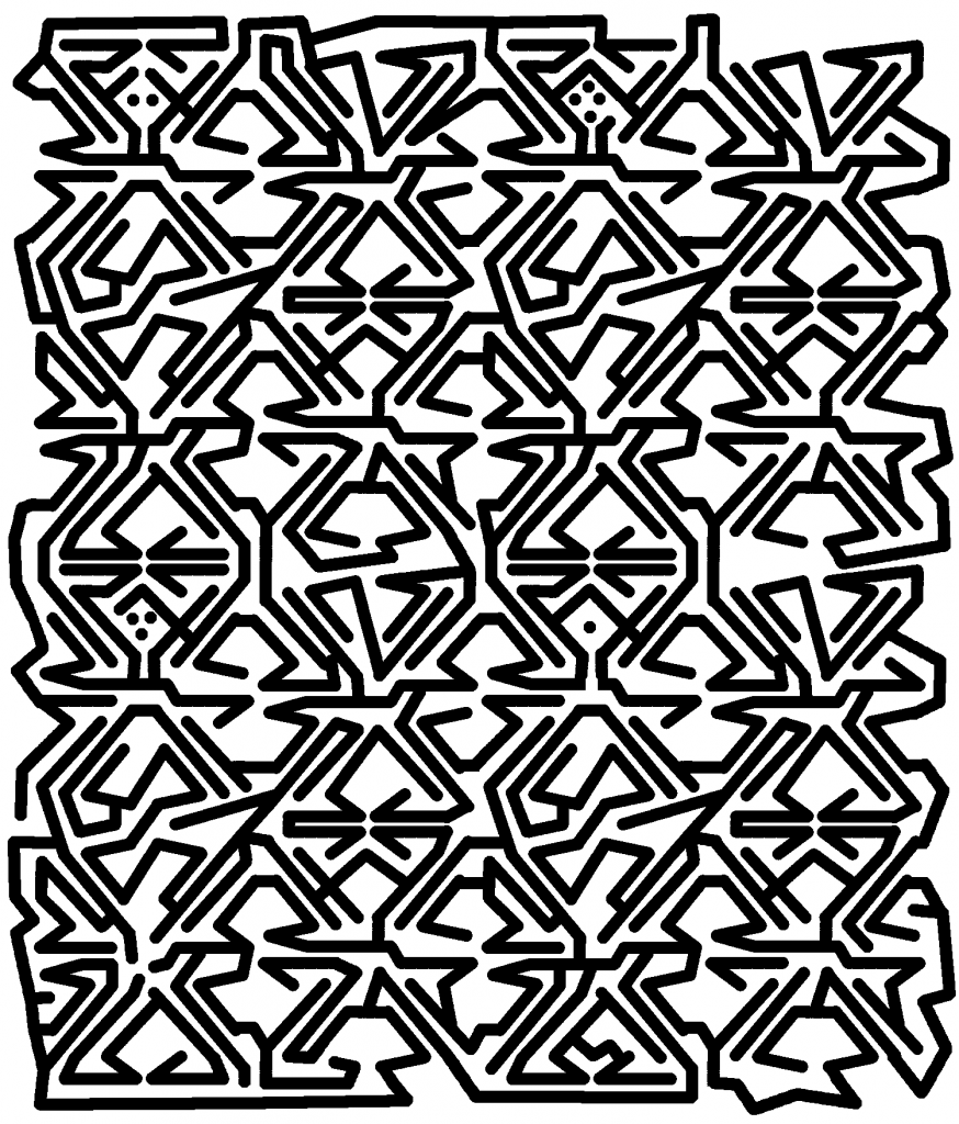 After a chat with my friend Patrick, I decided to use gimp to make a maze. Â I didn’t really know what to expect, but I hoped it would allow me to easily make something that looked like a drawing done with CAD. Â I don’t think it did that, but it pretty handily duplicated a complicated pattern into a 2 x 2 quadruple pattern which I tweaked to make a relatively difficult maze.
