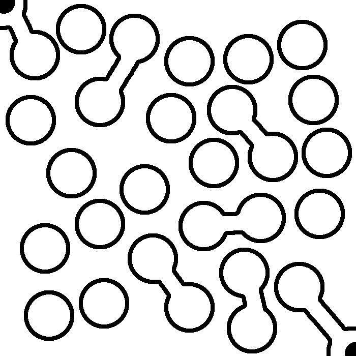 This maze features perhaps three distinct puzzles, each of which start at a black disc and end at the other.